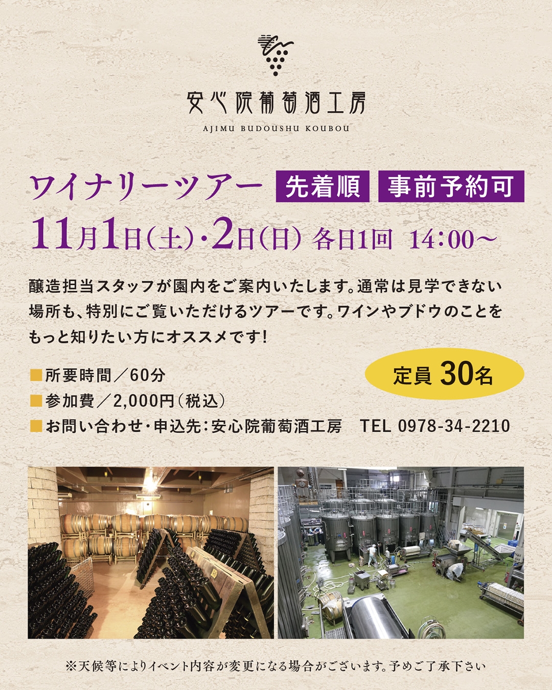 お問い合わせ・申込先 安心院葡萄酒工房 TEL0978-34-2210