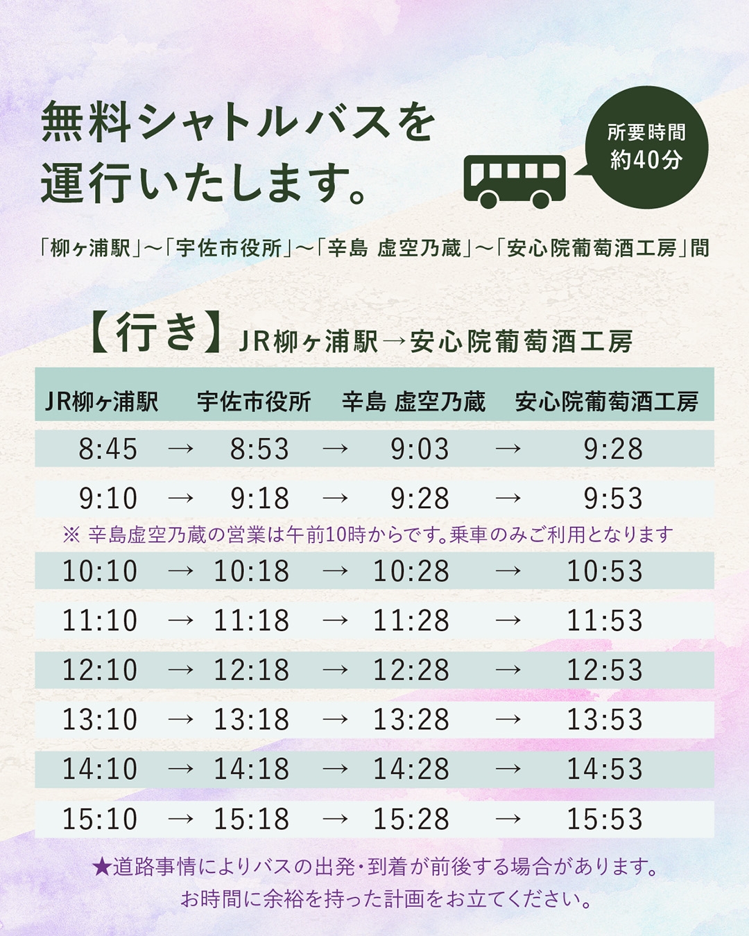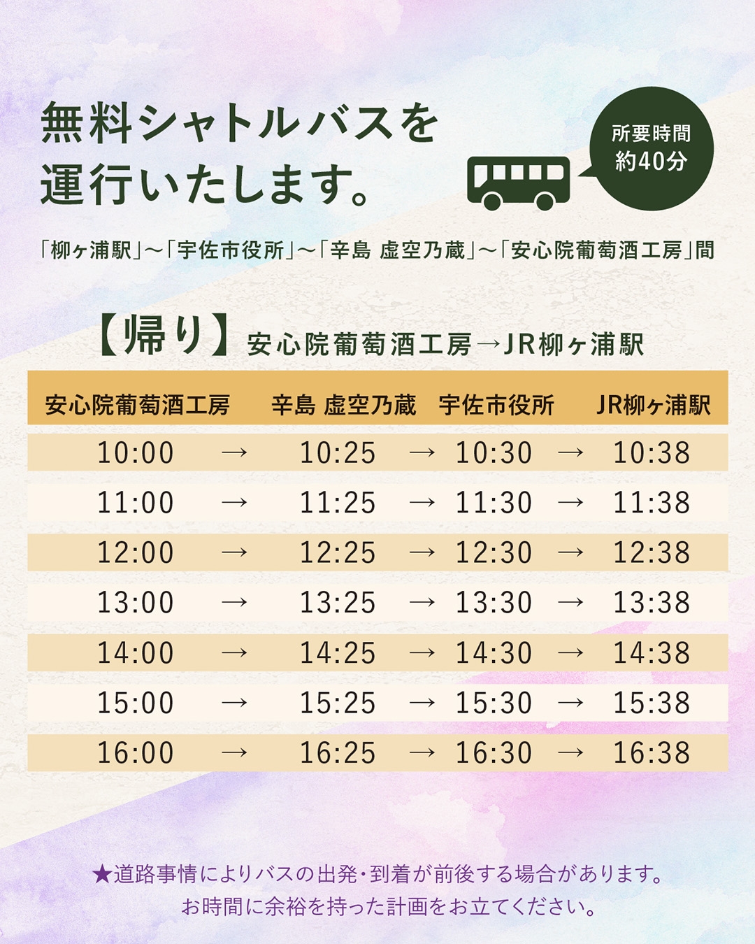 当イベント期間中のみ、柳ヶ浦駅より安心院葡萄酒工房まで無料シャトルバスを運行いたします。途中【宇佐市役所】【辛島 虚空乃蔵】を経由致します。