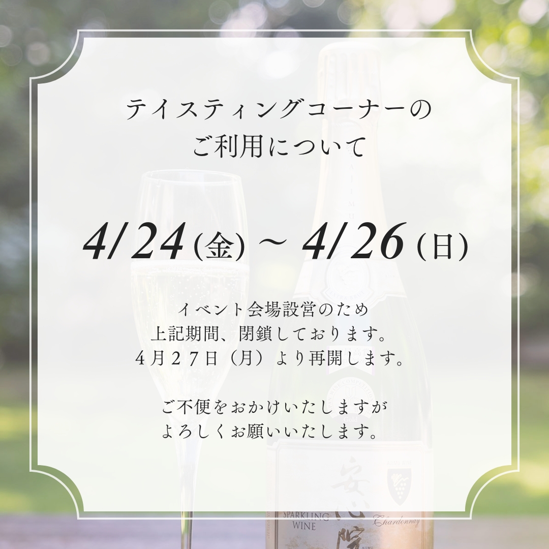 誠に勝手ながら4月24日~26日は、会場設営、イベントのためテイスティングコーナーを閉鎖します。