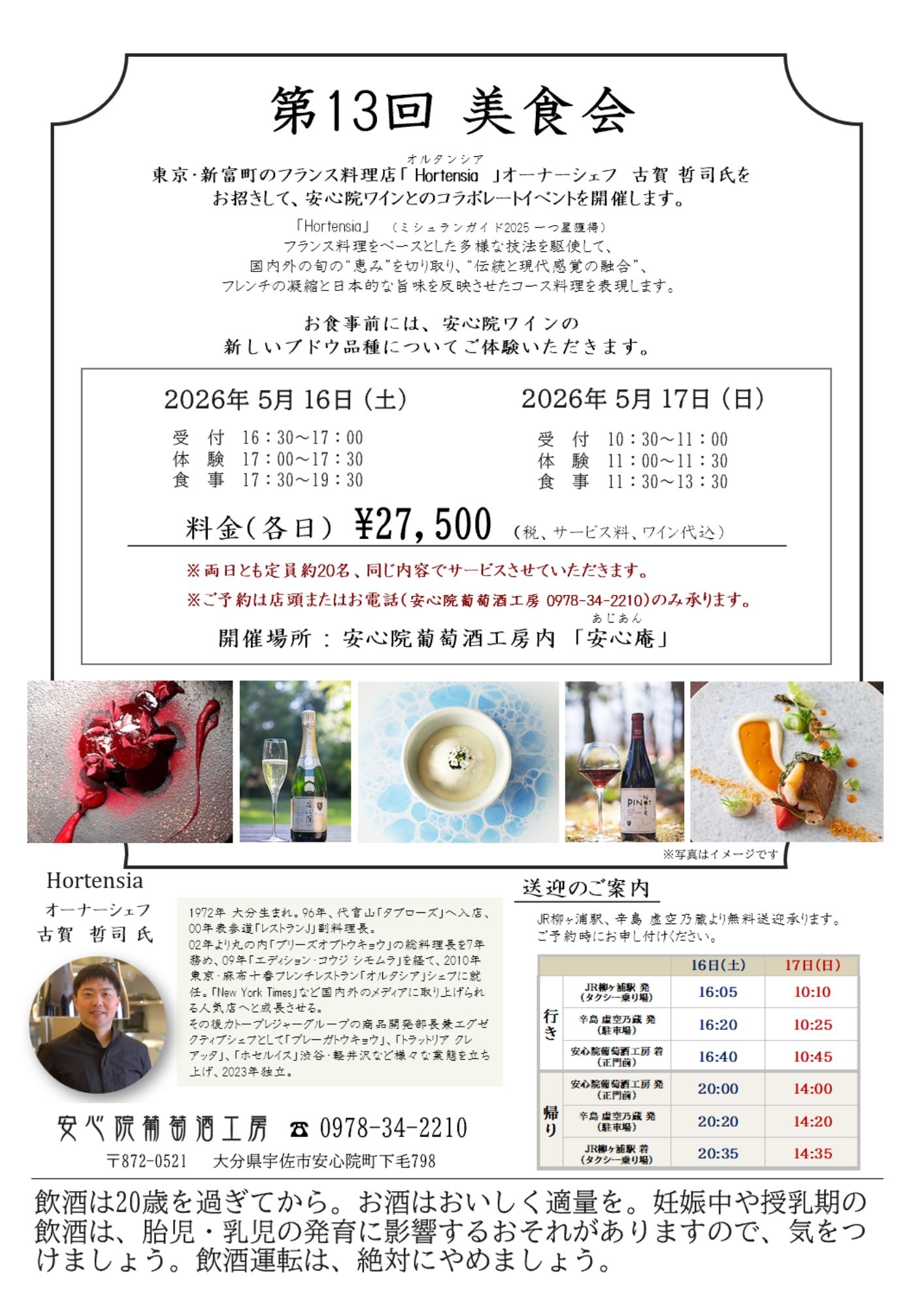 オーナーシェフ 古賀 哲司氏をお招きして、安心院ワインとのコラボレートイベントを開催します。